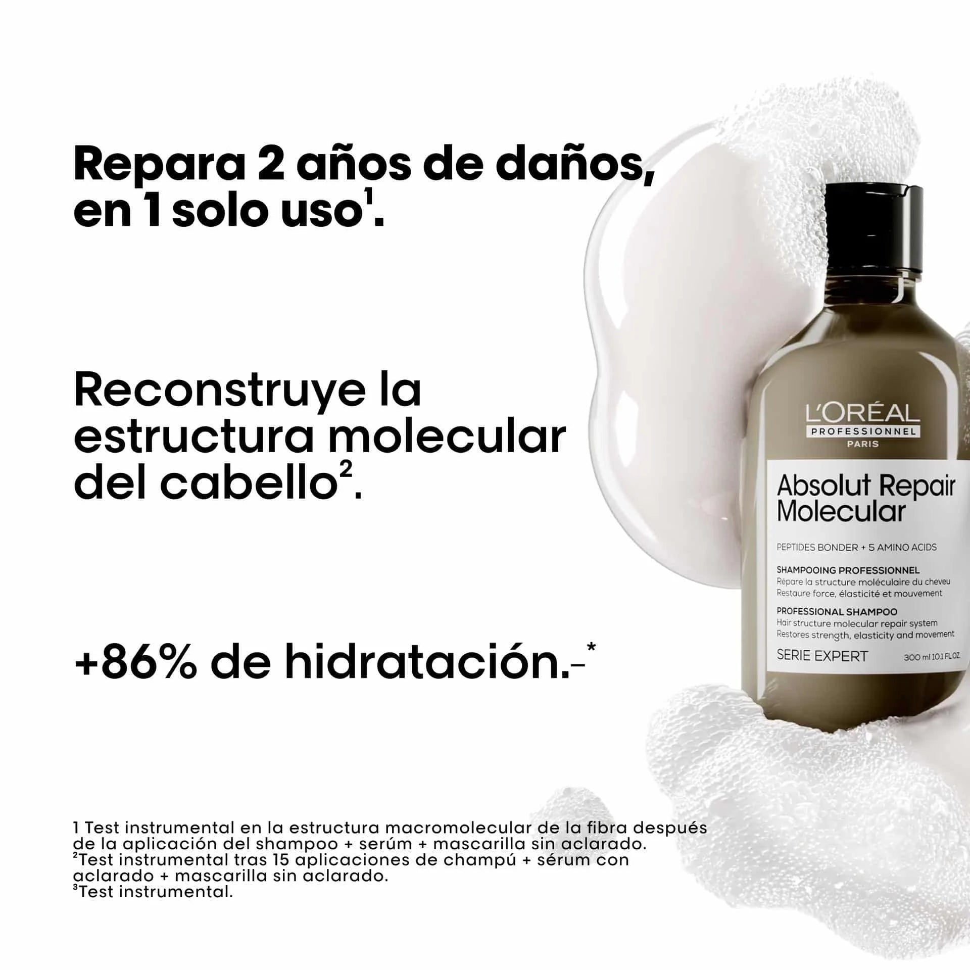 El champú Absolut Repair Molecular de L'Oréal Professionnel está diseñado para todo tipo de cabello dañado o muy dañado, incluyendo cabello teñido, aclarado y natural, cuya estructura molecular, compuesta por péptidos, se ha visto comprometida.