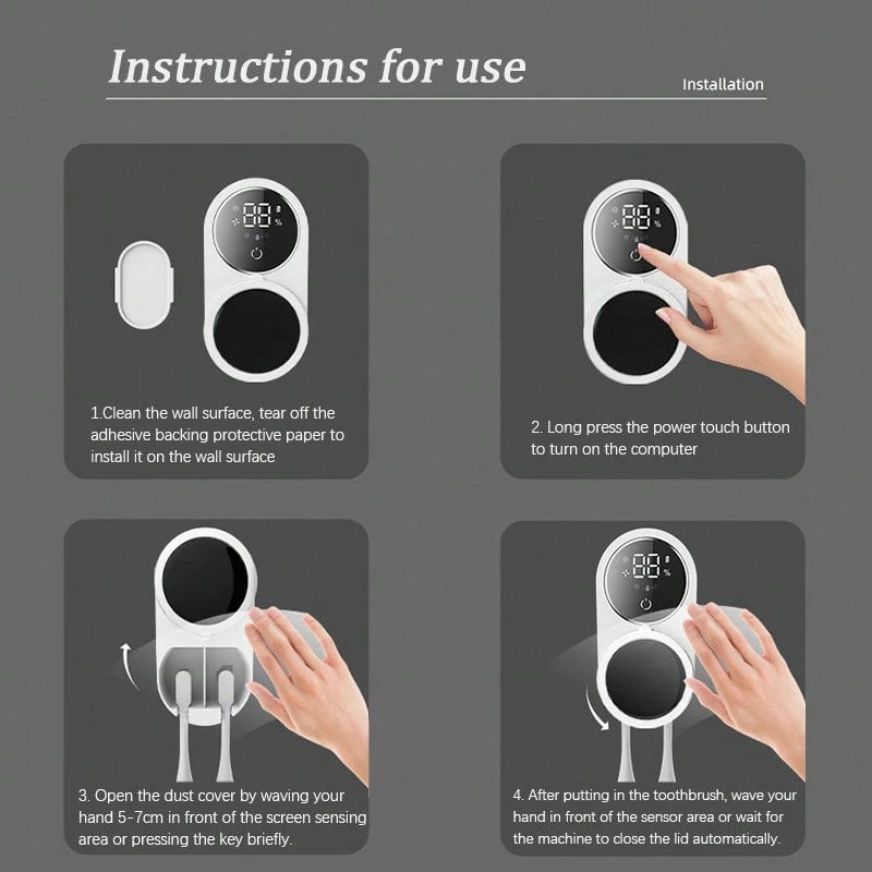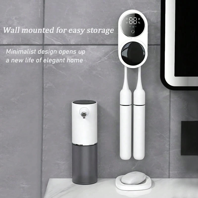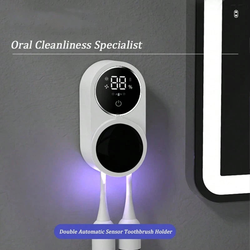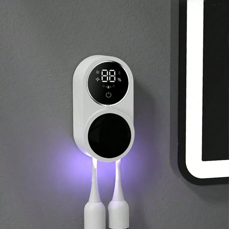 Esterilizador de dos cepillos de dientes con soporte para instalar en la pared.