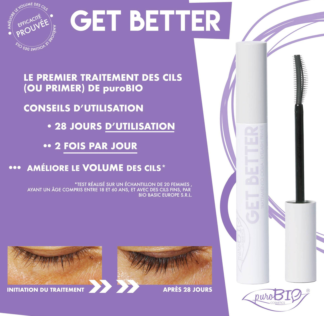 GET BETTER es una máscara transparente, adecuada como tratamiento potenciador del volumen para conseguir pestañas y cejas más pobladas.