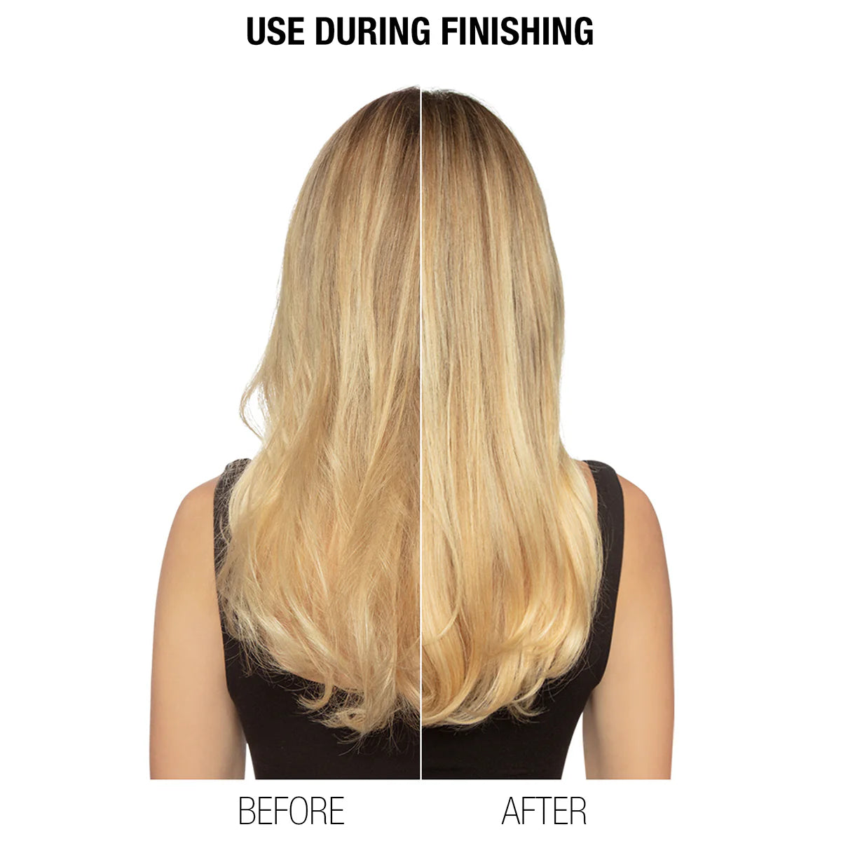 - Uso Como Acabado (Seco):Aplique una dosis mínima sobre el cabello ya seco y peinado para sellar el estilo, controlar los cabellos sueltos (flyaways) y potenciar el brillo final.