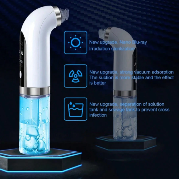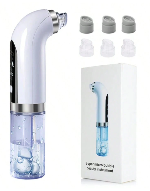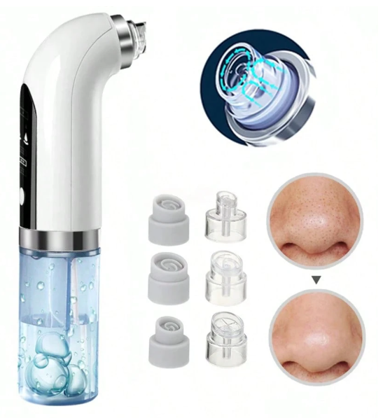 Limpiador eléctrico recargable de poros con succión para eliminar espinillas y puntos negros con ciclo de agua. El tanque separa el agua limpia de la sucia para prevenir la contaminación cruzada. Incluye 3 tipos de cabezas de succión diferentes.
